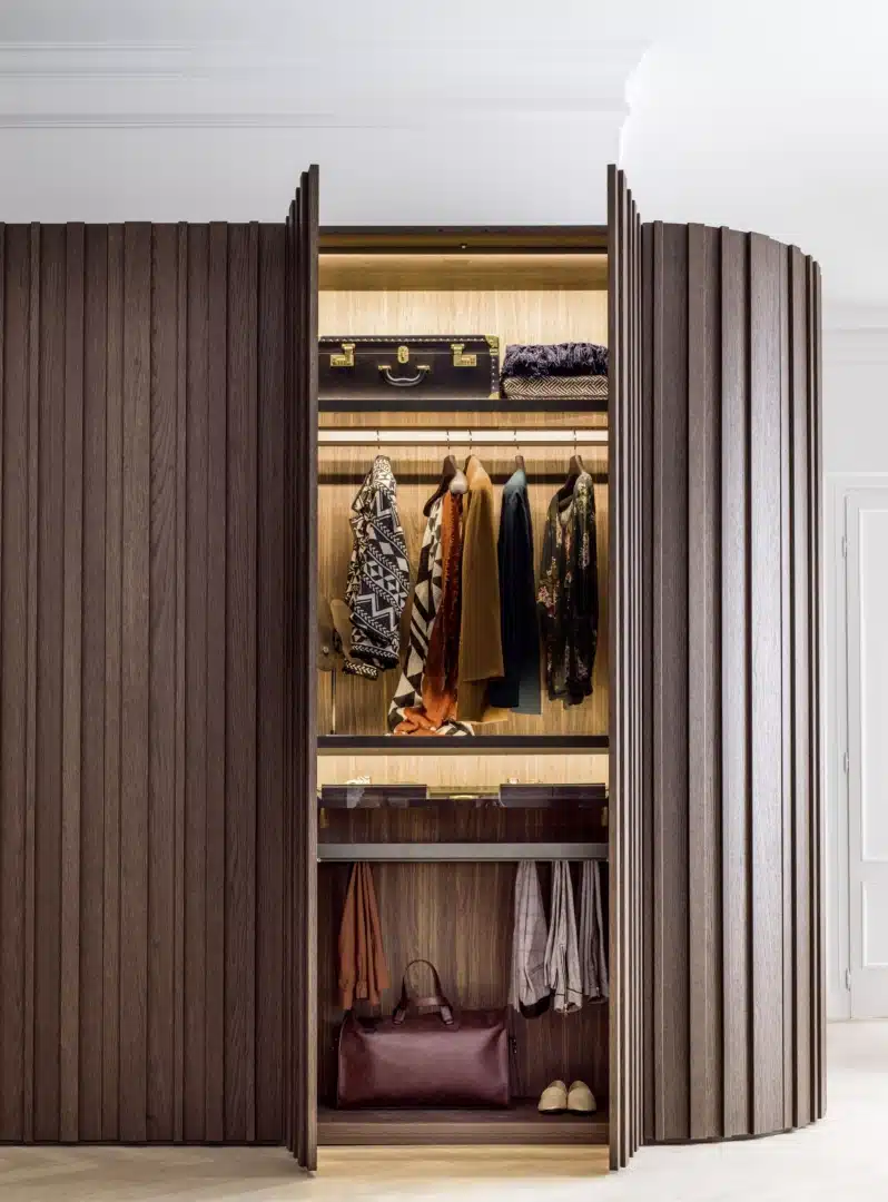 Antique richness meets modern practicality. Warm woods and marble surfaces are softened with gentle textiles and light tones, creating a space that feels luxurious yet restful. Storage is seamlessly integrated, ensuring everyday ease without compromising the room’s timeless elegance.